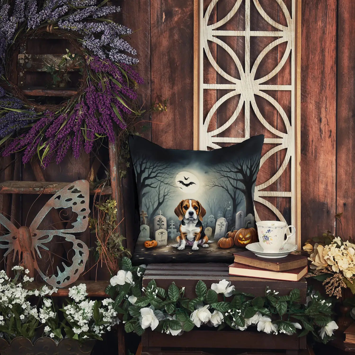 Throw Pillow featuring breed specific Beagle artwork. Celebrate Halloween with this Halloween Pillow. Add a touch of vibrancy and comfort to your outdoor seating with Caroline's Treasures Fabric Decorative Pillow. Measuring approximately 14 inches by 14 inches, this outdoor pillow is crafted to elevate the appeal of your patio furniture, infusing it with vivid color and artistic flair. The pillow includes a 100% Polyester Fabric sham filled with a quality pillow form to provide superior comfort. Innovatively made from our brand new material, specifically woven for its water resistance, this pillow is designed for durability. The soft canvas fabric offers versatility in use, fit for your indoor couch or your outdoor patio, porch, or veranda. The fabric is dyed with colorfast dyes built for resilience against weather conditions, ensuring the pillow retains its beauty over time. Constructed by sewing three fabric pieces to create a sham, the polyester insert is then nestled inside to form the pillow, resulting in an overstuffed pillow that maintains its shape. Both the sham and the pillow insert are proudly made in the United States. As the pillows are handcrafted, there may be minor variations in size, further enhancing their unique charm. Experience comfort in style with Caroline's Treasures Fabric Decorative Pillow.