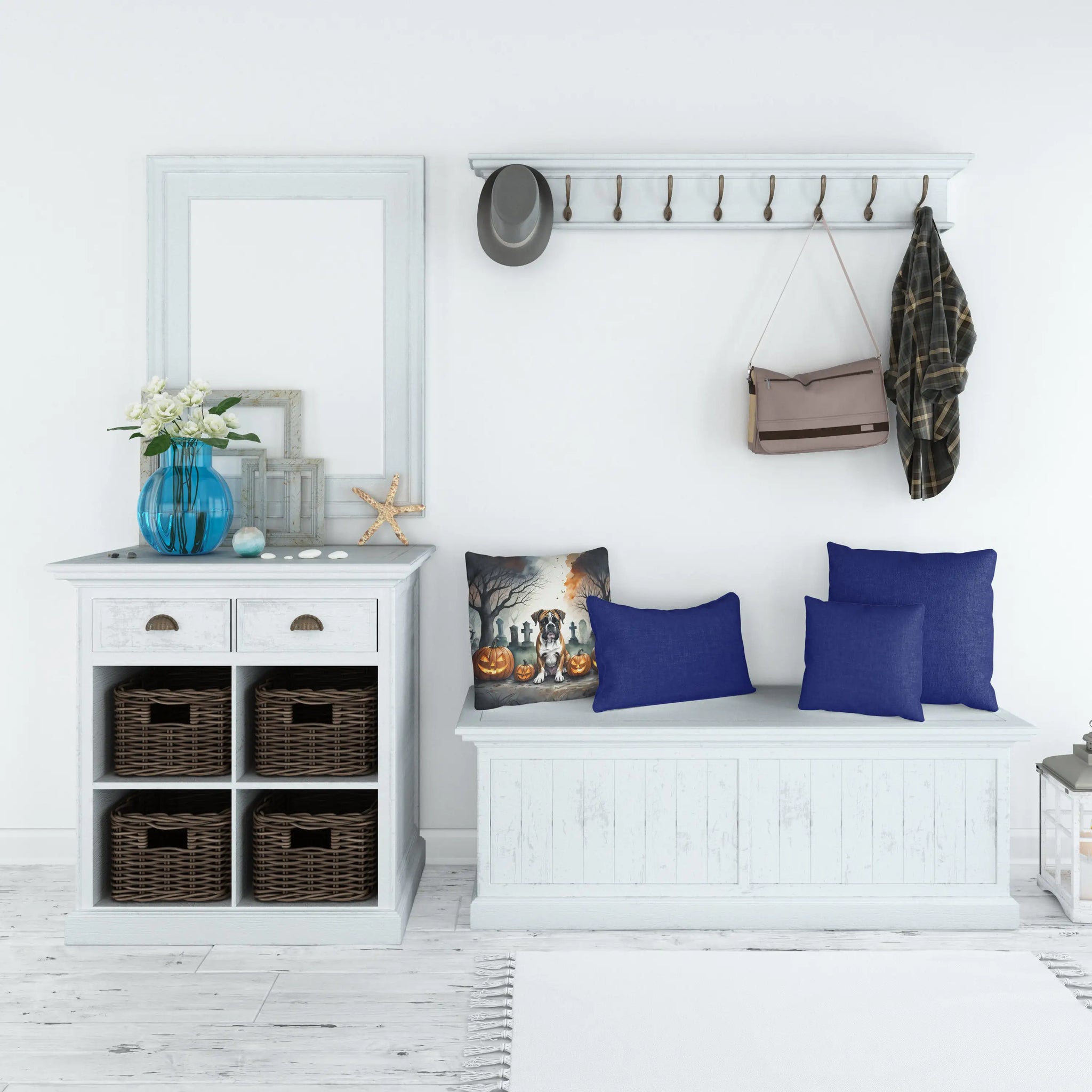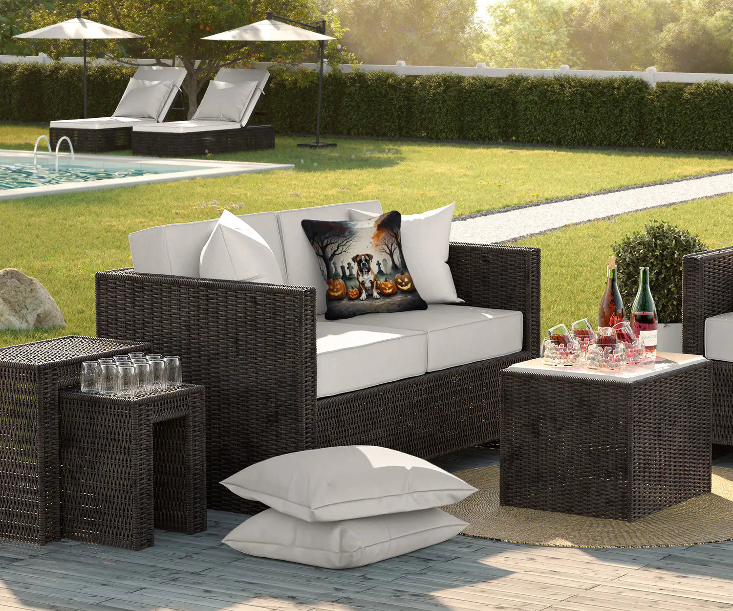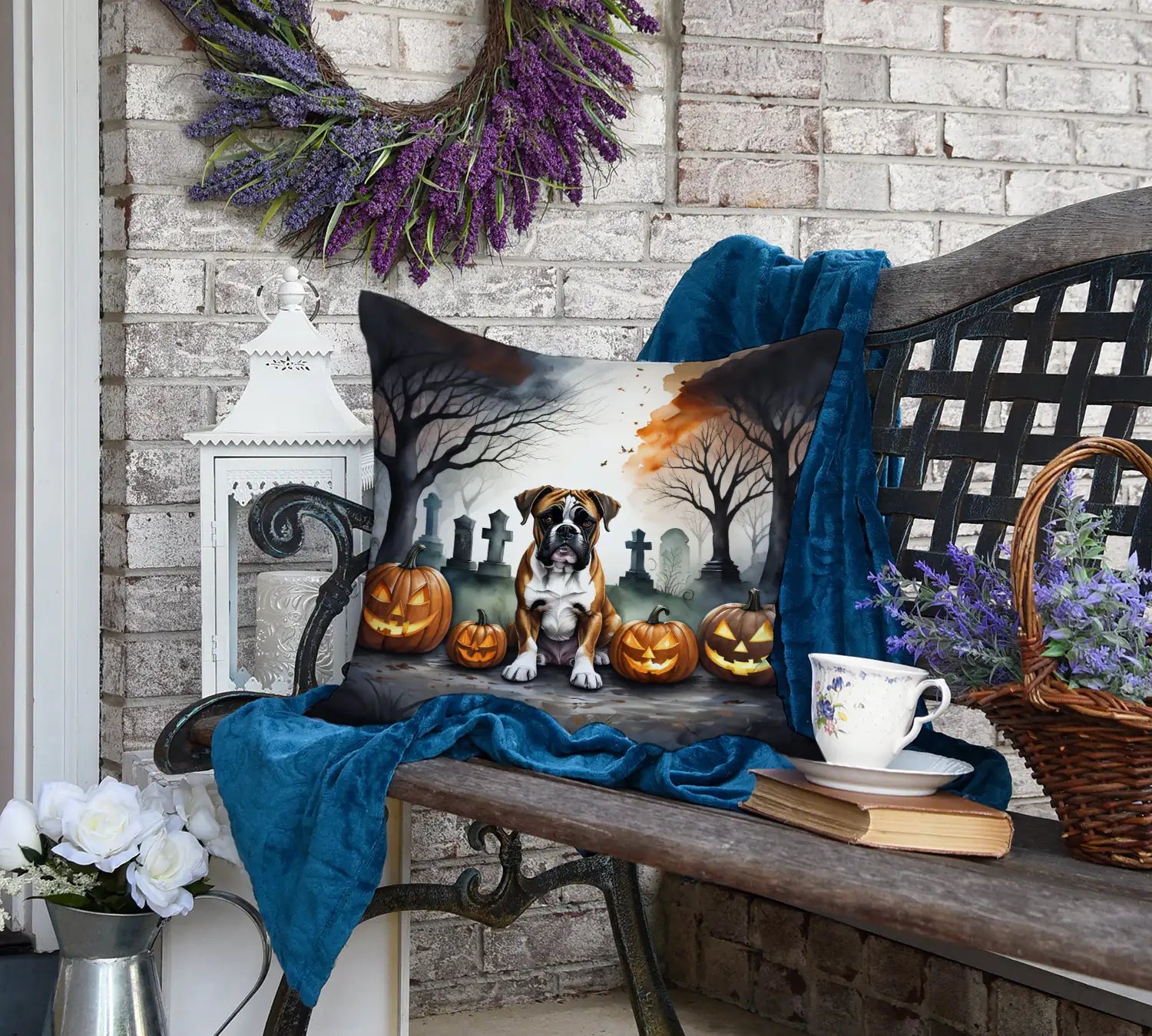 Throw Pillow featuring breed specific Boxer artwork. Celebrate Halloween with this Halloween Pillow. Revitalize your outdoor or indoor living space with Caroline's Treasures 18x18 Fabric Decorative Pillow. With a generously sized dimension of approximately 18 inches by 18 inches, this pillow makes a comfortable and aesthetic addition to any seating area. Made from a unique, water-resistant material developed by Caroline's Treasures, the pillow sham is 100% polyester fabric that's durable and ready to weather any condition. Its vibrant, full-color artwork will not fade over time as it is dyed with color-fast dyes. Whether you place it on your patio furniture, porch, veranda, or indoor couch, its soft canvas fabric ensures a cozy experience. The pillow is handcrafted in the United States, featuring a sham created from three pieces of fabric and a polyester insert for enduring shape and overstuffed comfort. Despite being robustly built to endure the outdoors, it is as soft and snug as your favorite indoor cushions. Please note, as all our pillows are handmade, sizes may vary slightly, adding to the charm of this unique decorative item.